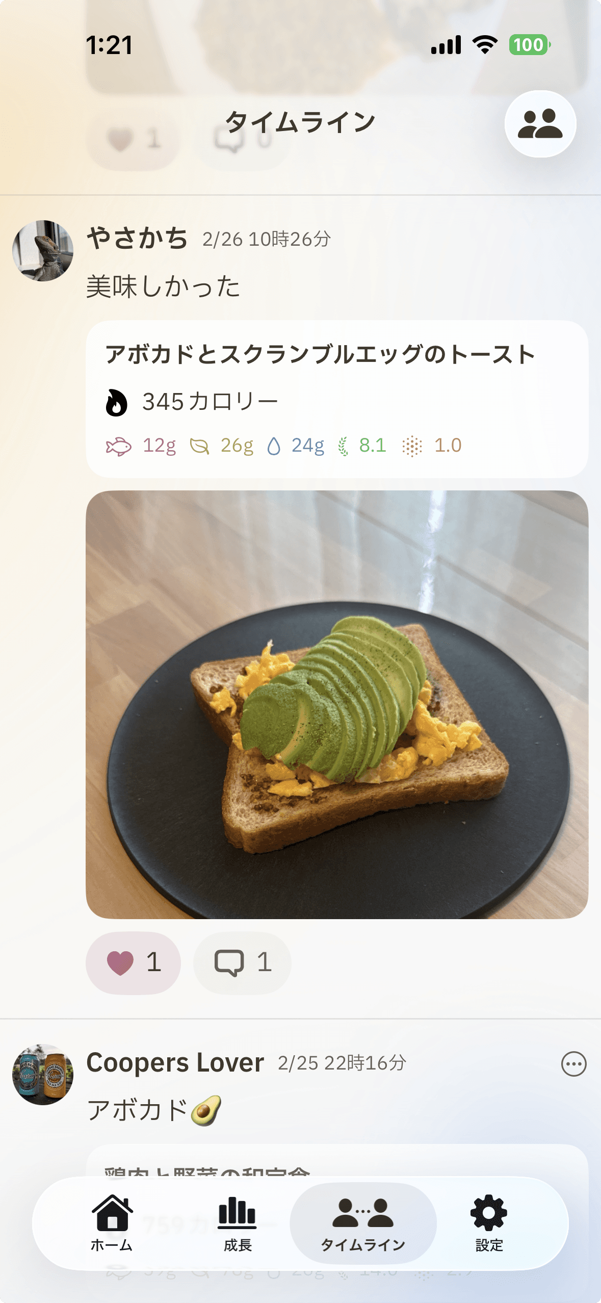 タイムラインで食事をシェアして、ゆるく繋がる。お互いに「いいね」し合うだけで、自然と記録が続くモチベーションに。