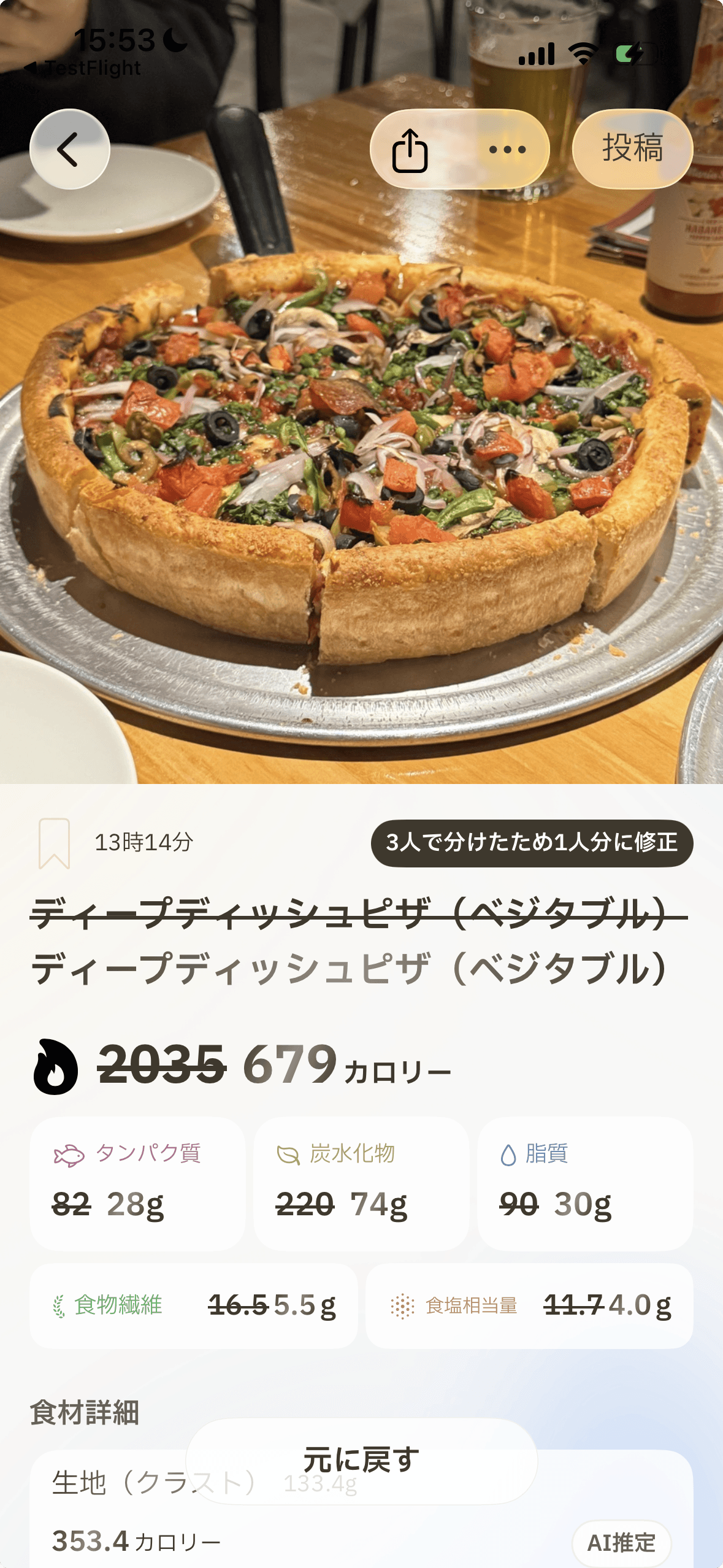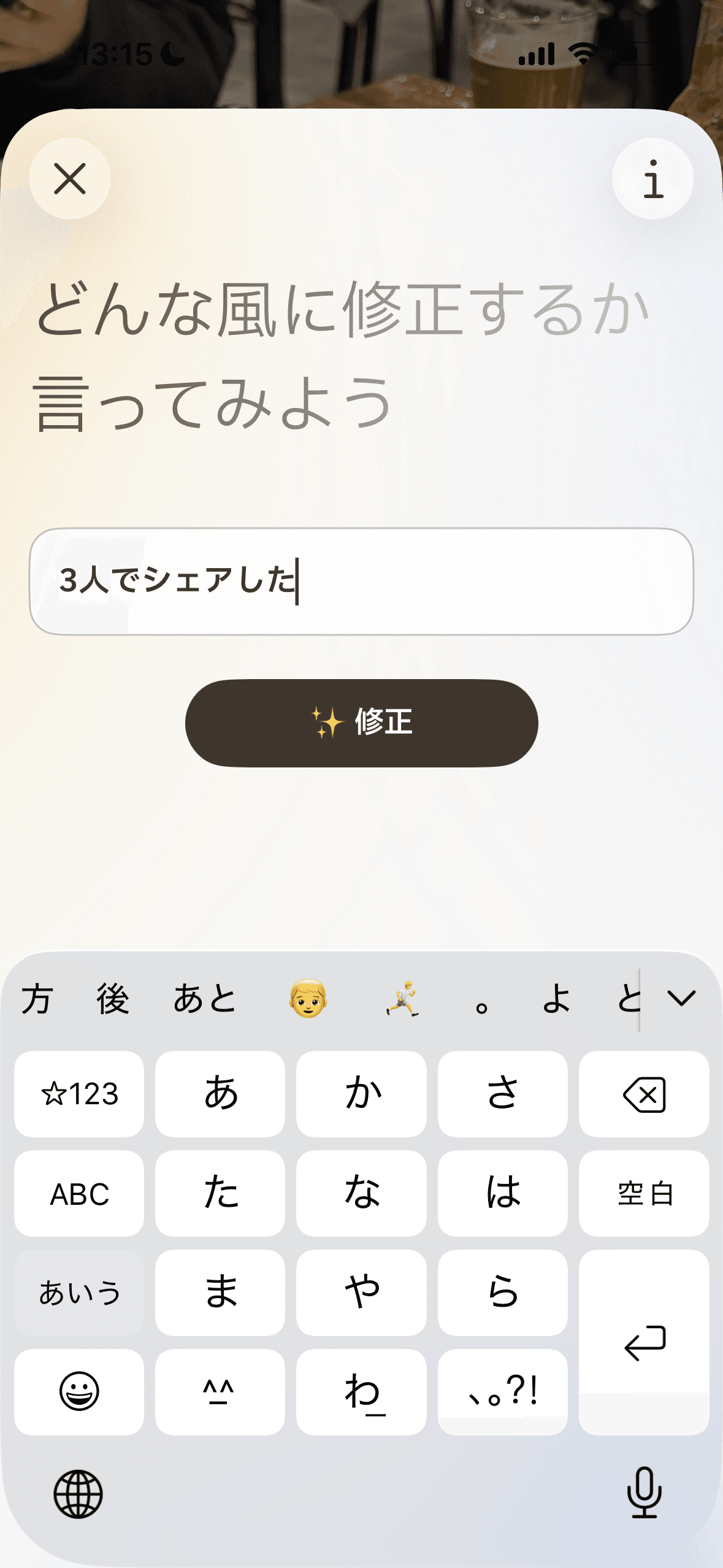 「3人でシェアした」「半分残した」。写真だけでは伝わらないことも、チャット感覚で伝えるだけ。AIが賢く修正します。